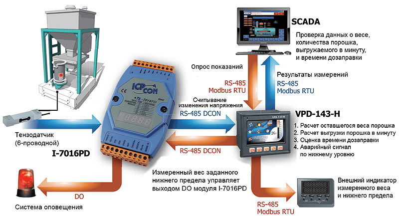Для устранения этих проблем компания ICP DAS предложила комплексное решение на базе тензометрического модуля I-7016PD и сенсорной панели оператора VPD-143-H. Данная система обеспечила высокую точность измерений, устойчивость к помехам и полноценную интеграцию с верхним уровнем.