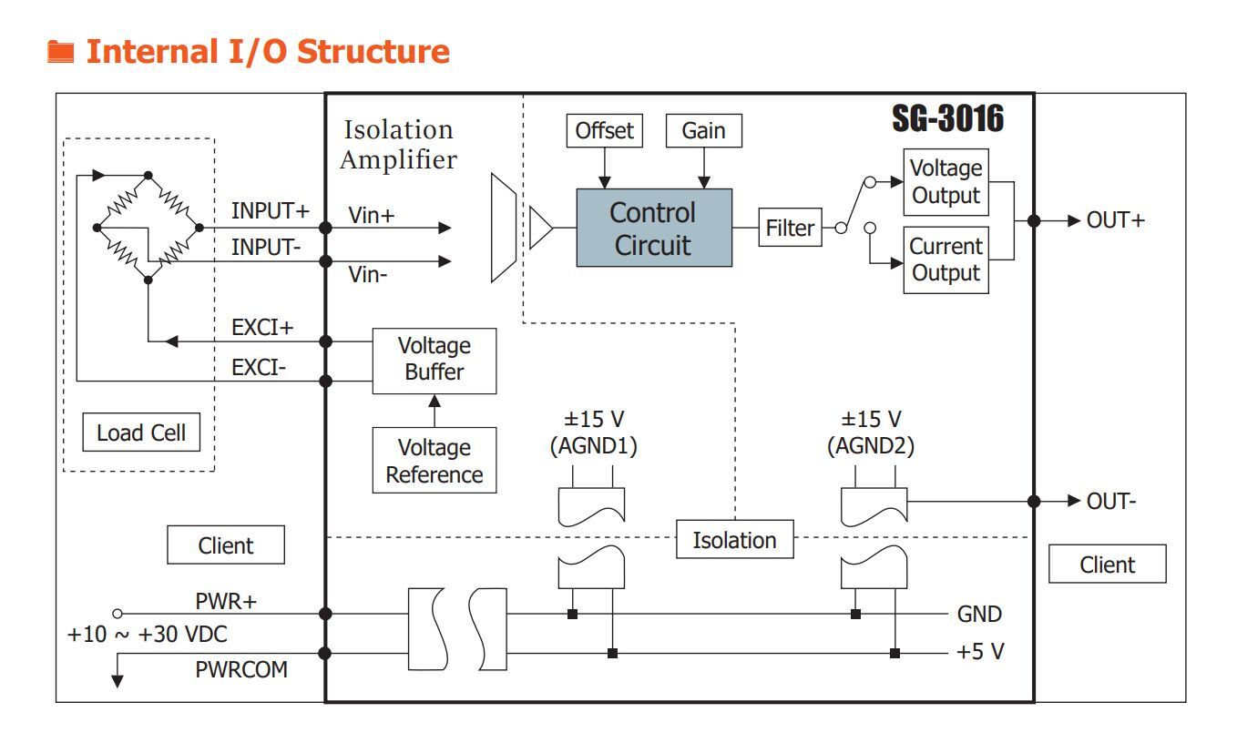 SG-3016-80 — это модуль преобразователь сигналов с тензодатчика с входом по напряжению и выходом по напряжению или току. Он оснащён трёхсторонней гальванической развязкой (1000 В постоянного тока) между входом, выходом и питанием. Диапазон входных/выходных сигналов можно изменять с помощью внутренних конфигурационных переключателей.